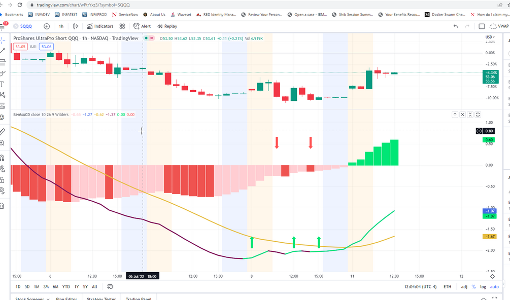 So what is this? It's a MACD indicator, BenMACD to be precise, that works with Trading View. It takes the guesswork out of the "curls" of the MACD. "I think it's curling up? Is it going up? I can't tell Let me check the blue line and subtract..." This solves that problem, visually. It alerts you with big red arrows and big green arrows, a color-changing MACD line, and has built in visual and audio alerting, including email, application popups, and several different sounds. It also has a Bullish/Bearish confirmation component.